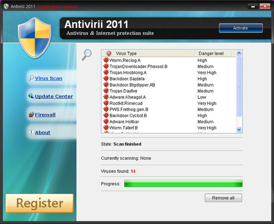 The majority of the sites that we found affected by Trojan-downloaders were used to distribute Antivirii 2011, other scareware, and spyware. However, we still believe that this rogue anti-virus won't become a widespread infection. FakeAV programs appear legitimate, they create speech bubbles and genuine looking security alerts to scare you into thinking that your computer is infected. To minimize your chances of being affected by a fake antivirus scam, you should only download and install software from official websites. Once Antivirii 2011 is installed, it will pretend to scan your computer for malicious software, you know spyware, adware, Trojans, keyloggers and similar stuff. It blocks Task Manager and some other Windows tools/utilities. It may block your web browser as well. If you can't use it, reboot your PC in safe mode with networking. Of course, it displays fake warnings that say things like: